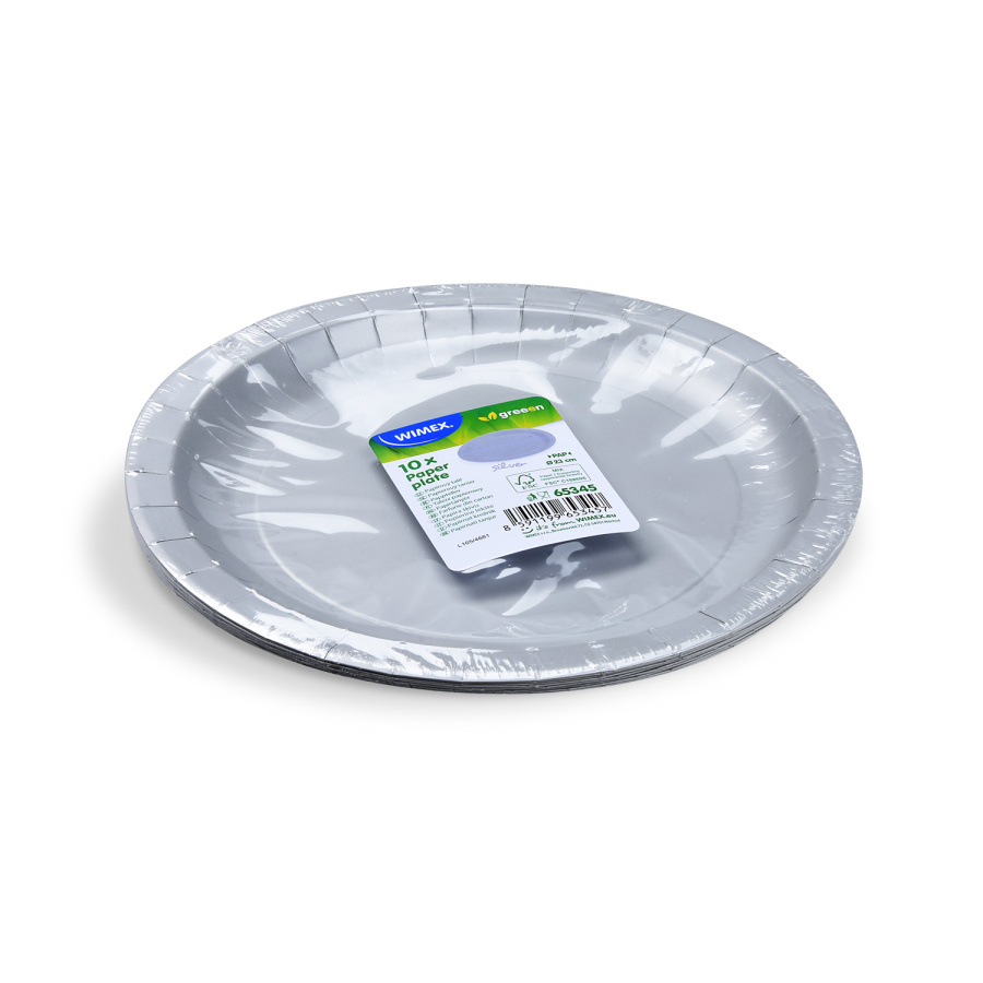Kvalitní papírové talíře stříbrné na jedno použití. Průměr talířů je 23cm. Papírové talíře jsou baleny po 10 kusech. FSC Mix - materiál z kontrolovaných zdrojů. Tento certifikát zajišťuje, že těžba dřeva a jiných nedřevních lesních produktů, zachovává lesní biodiverzitu, produktivitu a přípodní procesy. Šířka / Průměr [cm] 23. Výška [cm] 1,6. ( Karton - 30 balení ). U zboží označeného SKLADEM expedujeme v pracovní dny obvykle do 24 hodin po objednání.Alternativní produkty