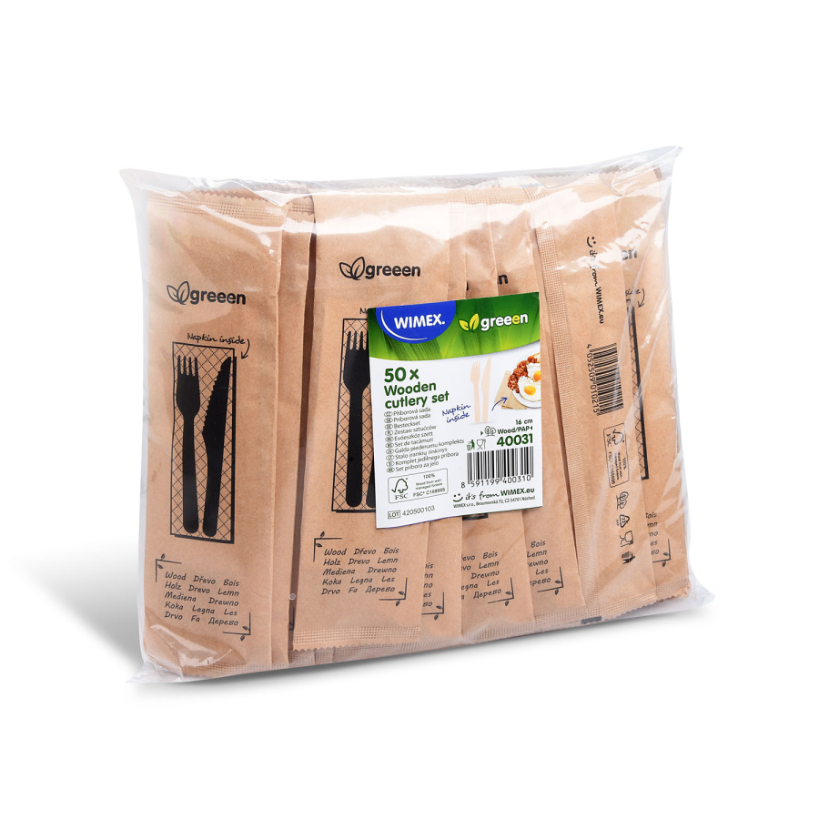 Sada dřevěných příborů (FSC 100%/PAP) nůž+vidlička+ubrousek [50sad]